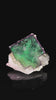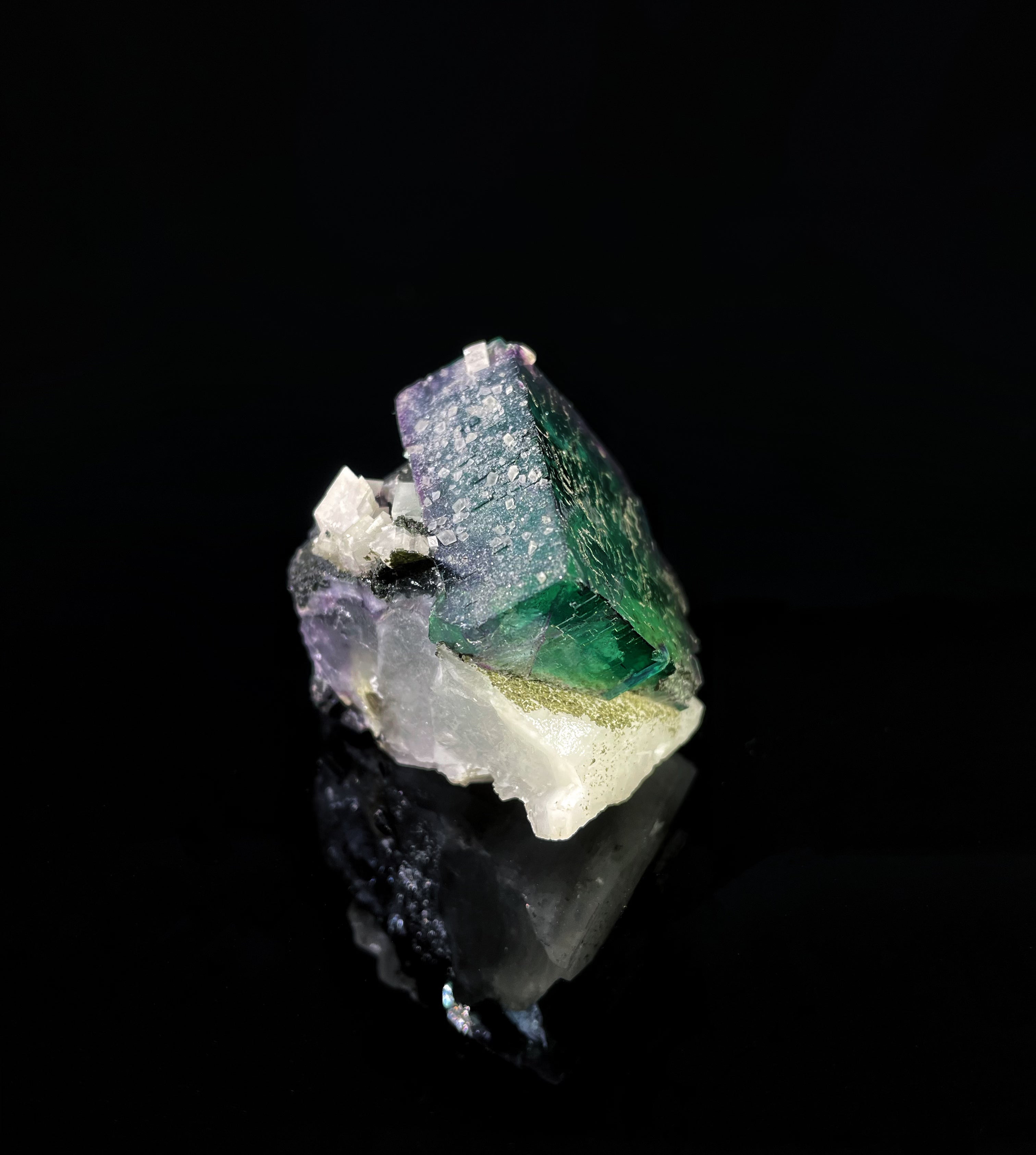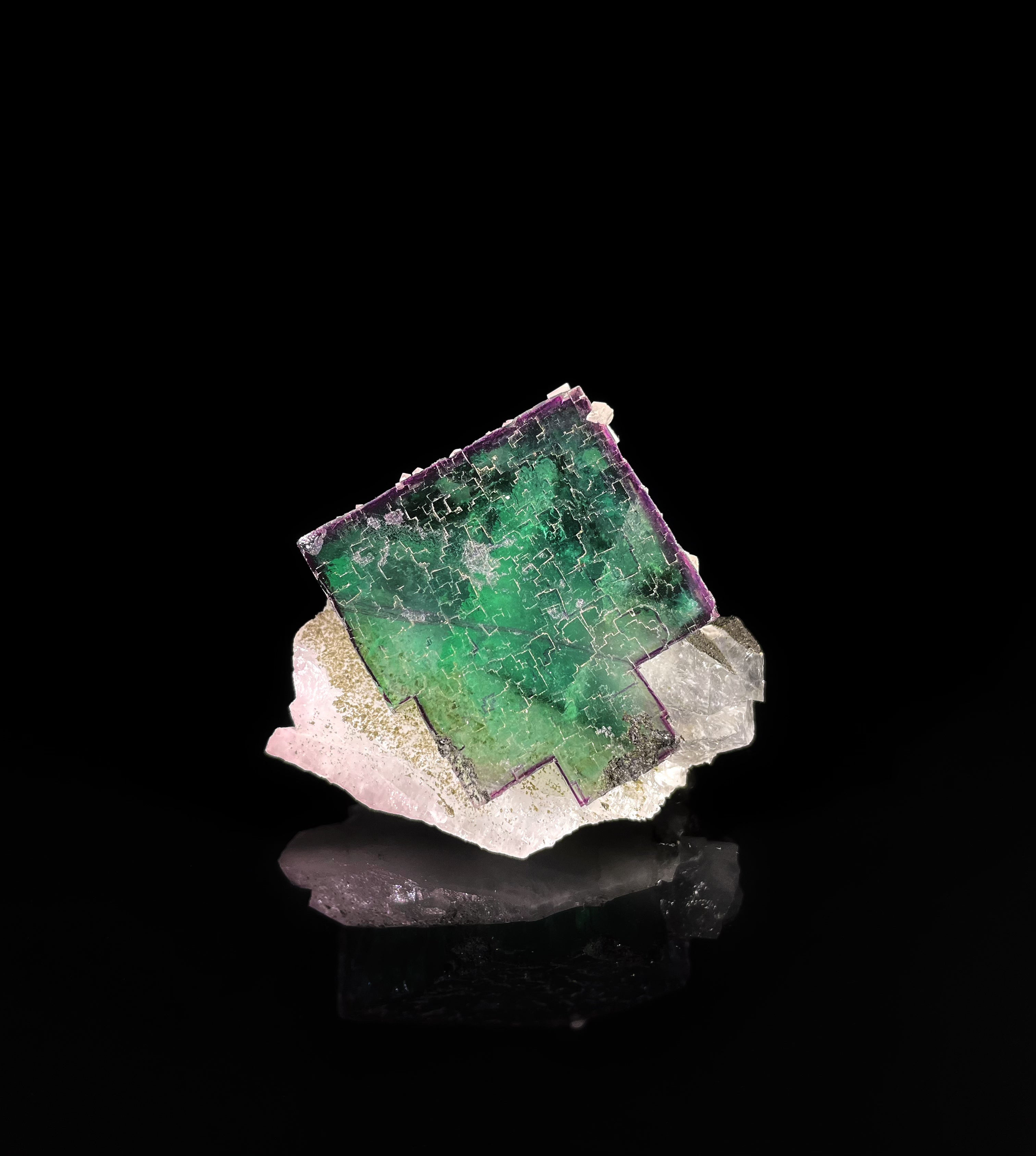A piece of green fluorite with quartz, originating from Yaogangxian, Chenzhou, Hunan Province. The overall shape of this fluorite is closer to a rhombus. The entire fluorite crystal is epigrowth (grows atop) the quartz. The edges of the green fluorite are bordered with a purple hue. The front surface of the fluorite retains fine, dense growth lines, which glitter brightly under the reflection of light. On both the left and right sides of the fluorite, white calcite crystals have crystallized, resembling a layer of frosting. This Yaogangxian fluorite specimen is not only as visually appealing as a dessert but also possesses excellent qualities as a mineral specimen.