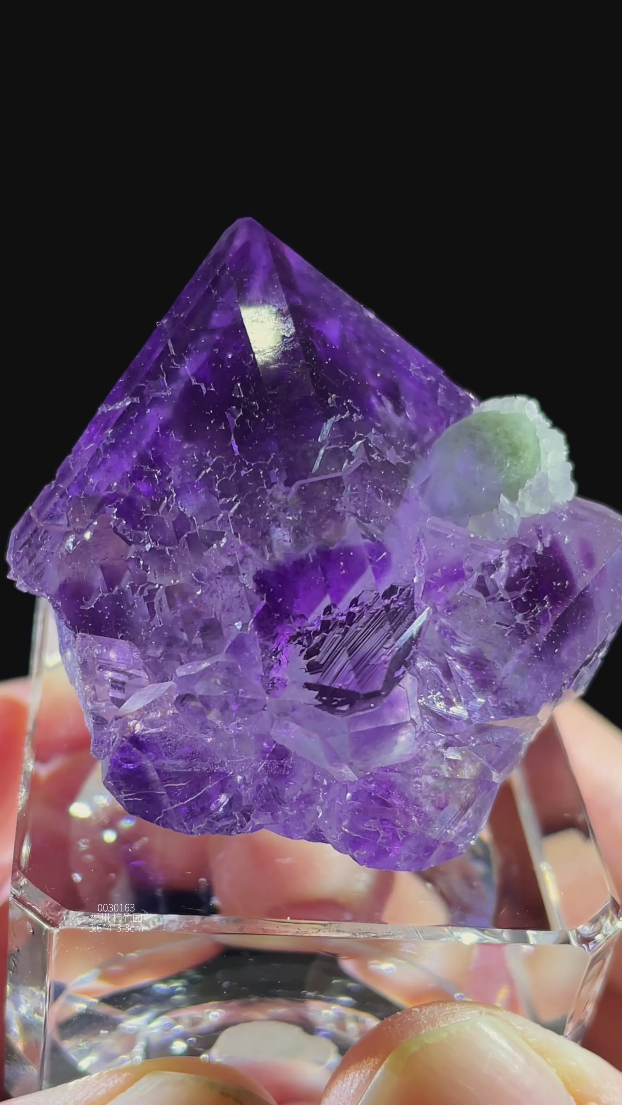 A piece of purple fluorite from Shizhuyuan, Chenzhou City, Hunan Province. The crystal form of this purple fluorite presents a pyramidal shape, and unique planar structures have formed on all four edges of the pyramid. When viewed from directly above, there is a rich purple color block located exactly at the center inside the translucent fluorite. A light green fluorite crystal has epitaxially grown on the upper right corner, and its shape resembles a Buddha's head. The entire piece of fluorite is of excellent quality and has an extremely unique and rare form. It is a very rare fluorite specimen and is recommended for collection.