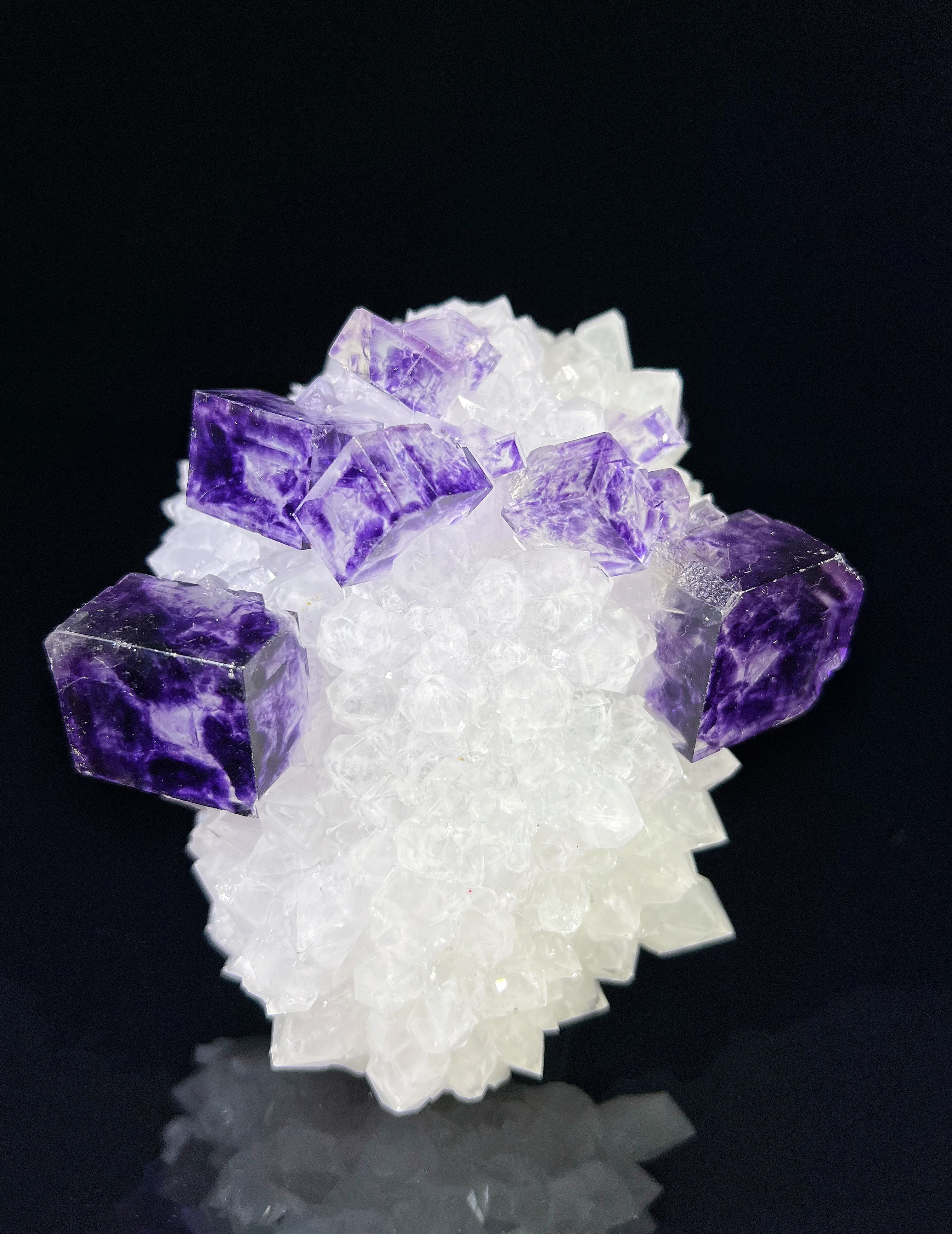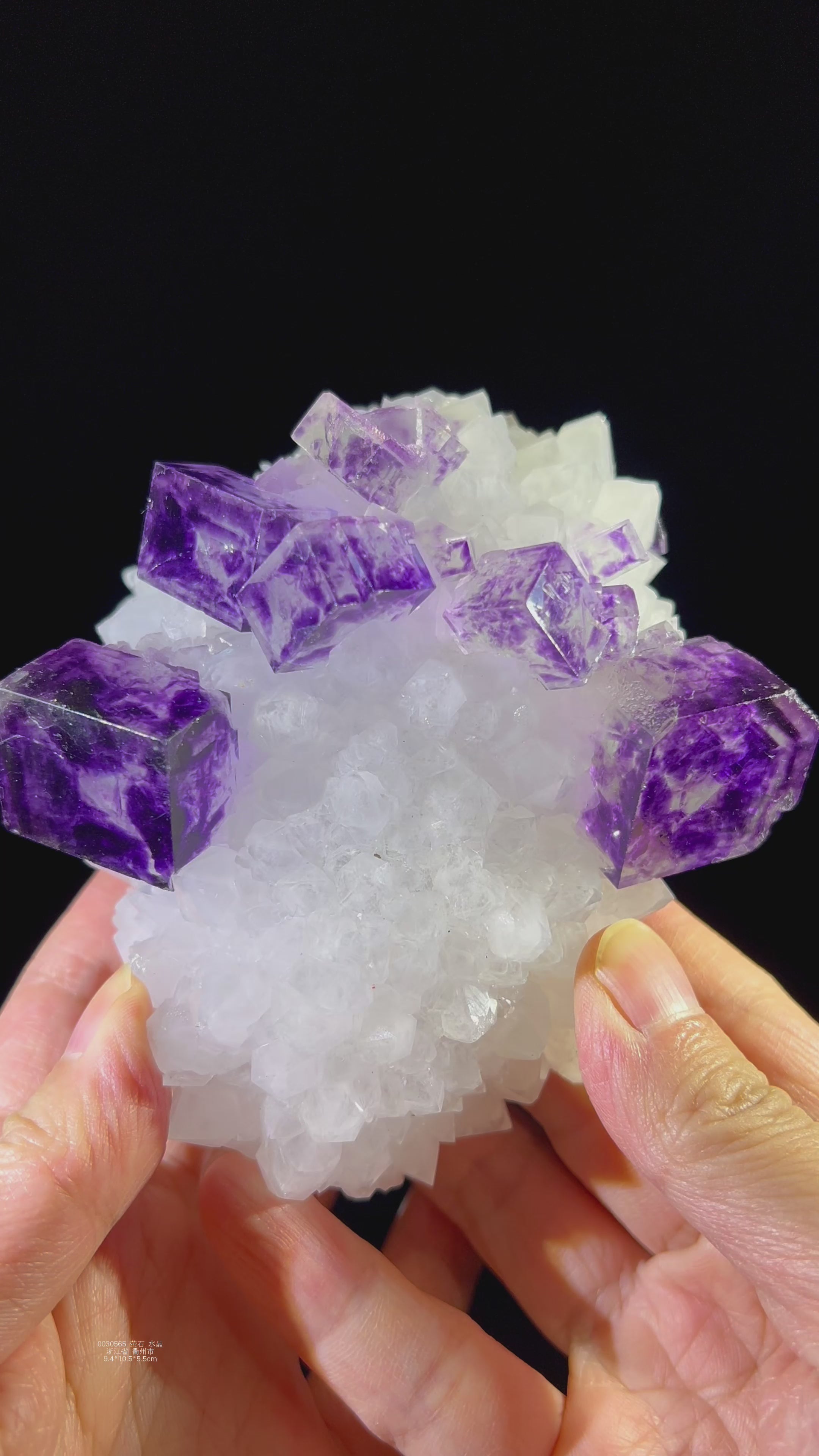 A piece of purple Fluorite on Quartz from Quzhou, Zhejiang Province. Each fluorite has bright purple phantoms inside. The shape of this specimen basically presents a symmetrical structure. Small fluorite pieces are also evenly distributed in the upper part. The crystal layer at the bottom is also pure white and flawless, extremely clean. This piece is both aesthetically pleasing and valuable for specimen collection, making it well worth purchasing.
